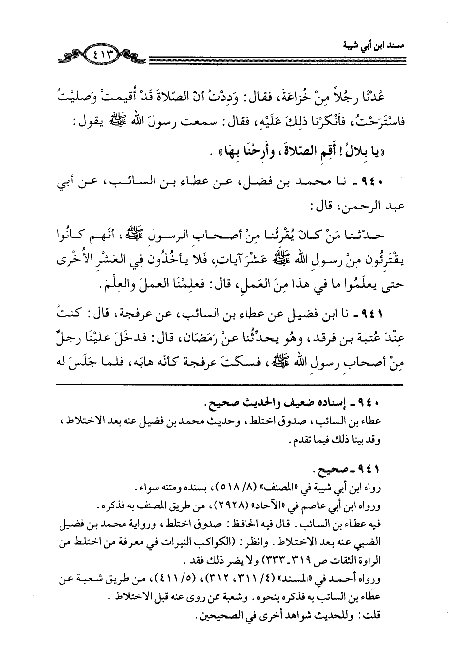 نا مُحَمَّدُ بْنُ فَضْلٍ، عَنْ عَطَاءِ بْنِ السَّائِبِ، عَنْ أَبِي عَبْدِ الرَّحْمَنِ، قَالَ: حَدَّثَنَا مَنْ كَانَ يُقْرِئُنَا مِنْ أَصْحَابِ الرَّسُولِ صَلَّى اللهُ عَلَيْهِ وَسَلَّمَ، أَنَّهُمْ كَانُوا «§يَقْتَرِئُونَ مِنْ رَسُولِ اللَّهِ صَلَّى اللهُ عَلَيْهِ وَسَلَّمَ عَشْرَ آيَاتٍ، فَلَا يَأْخُذُونَ فِي الْعَشْرِ الْأُخْرَى حَتَّى يَعْلَمُوا مَا فِي هَذَا مِنَ الْعَمَلِ» ، قَالَ: «فَعَلِمْنَا الْعَمَلَ وَالْعِلْمَ»