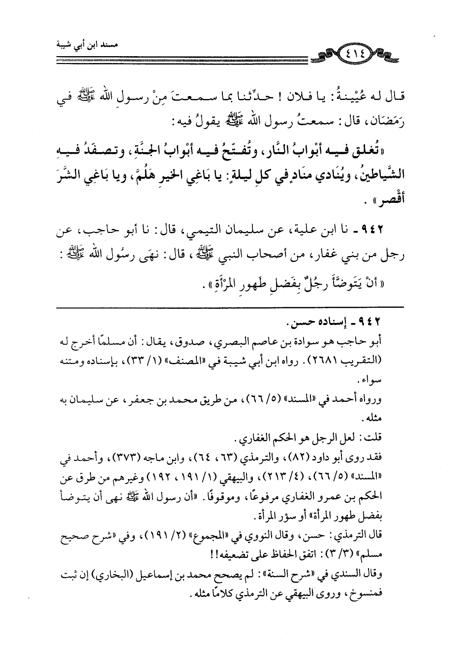 942 - نا ابْنُ عُلَيَّةَ، عَنْ سُلَيْمَانَ التَّيْمِيِّ، قَالَ: نا أَبُو حَاجِبٍ، عَنْ رَجُلٍ مِنْ بَنِي غِفَارٍ، مِنْ أَصْحَابِ النَّبِيِّ صَلَّى اللهُ عَلَيْهِ وَسَلَّمَ، قَالَ: «§نَهَى رَسُولُ اللَّهِ صَلَّى اللهُ عَلَيْهِ وَسَلَّمَ أَنْ يَتَوَضَّأَ رَجُلٌ بِفَضْلِ طَهُورِ الْمَرْأَةِ»