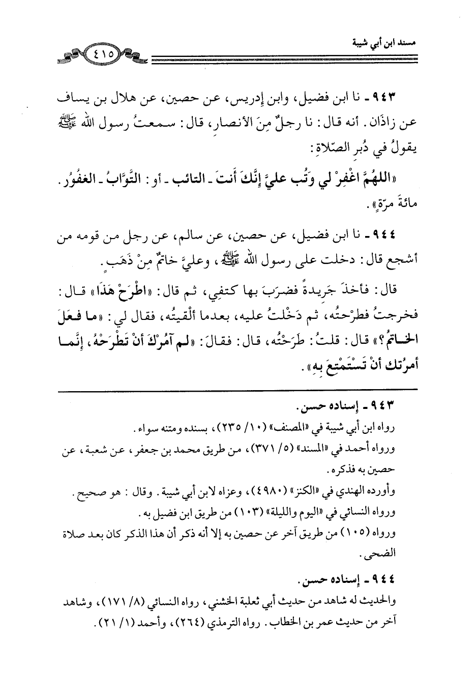 943 - نا ابْنُ فُضَيْلٍ، وَابْنُ إِدْرِيسَ، عَنْ حُصَيْنٍ، عَنْ هِلَالِ بْنِ يَسَافٍ، عَنْ زَاذَانَ، أَنَّهُ قَالَ: نا رَجُلٌ، مِنَ الْأَنْصَارِ، قَالَ: سَمِعْتُ رَسُولَ اللَّهِ صَلَّى اللهُ عَلَيْهِ وَسَلَّمَ يَقُولُ فِي دُبُرِ الصَّلَاةِ: «§اللَّهُمَّ اغْفِرْ لِي وَتُبْ عَلَيَّ إِنَّكَ أَنْتَ التَّائِبُ - أَوِ التَّوَّابُ - الْغَفُورُ» مِائَةَ مَرَّةٍ