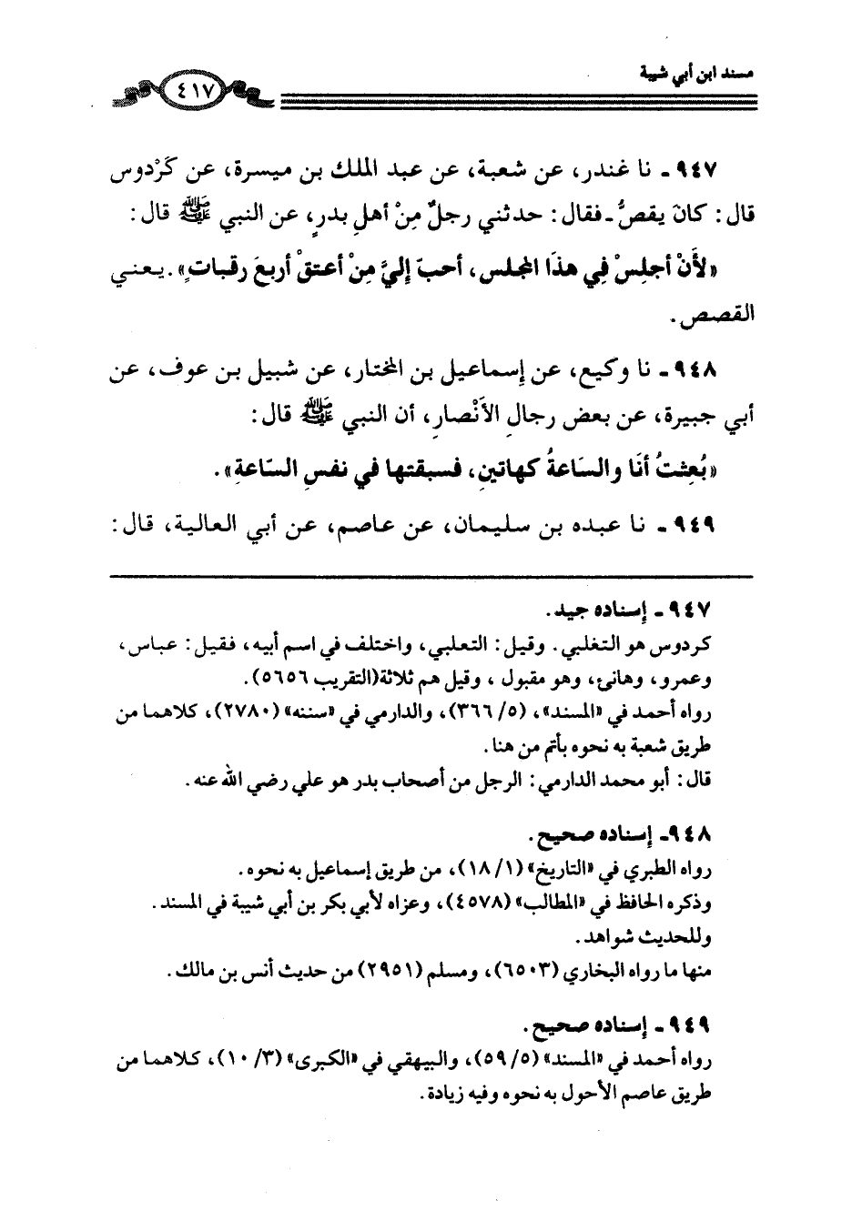 947 - نا غُنْدَرٌ، عَنْ شُعْبَةَ، عَنْ عَبْدِ الْمَلِكِ بْنِ مَيْسَرَةَ، عَنْ كُرْدُوسَ، قَالَ: كَانَ يَقُصُّ فَقَالَ: حَدَّثَنِي رَجُلٌ، مِنْ أَهْلِ بَدْرٍ، عَنِ النَّبِيِّ صَلَّى اللهُ عَلَيْهِ وَسَلَّمَ قَالَ: «§لَأَنْ أَجْلِسَ فِي هَذَا الْمَجْلِسِ أَحَبُّ إِلَيَّ مِنْ أَنْ أَعْتِقَ أَرْبَعَ رَقَبَاتٍ» - يَعْنِي الْقَصَصَ -