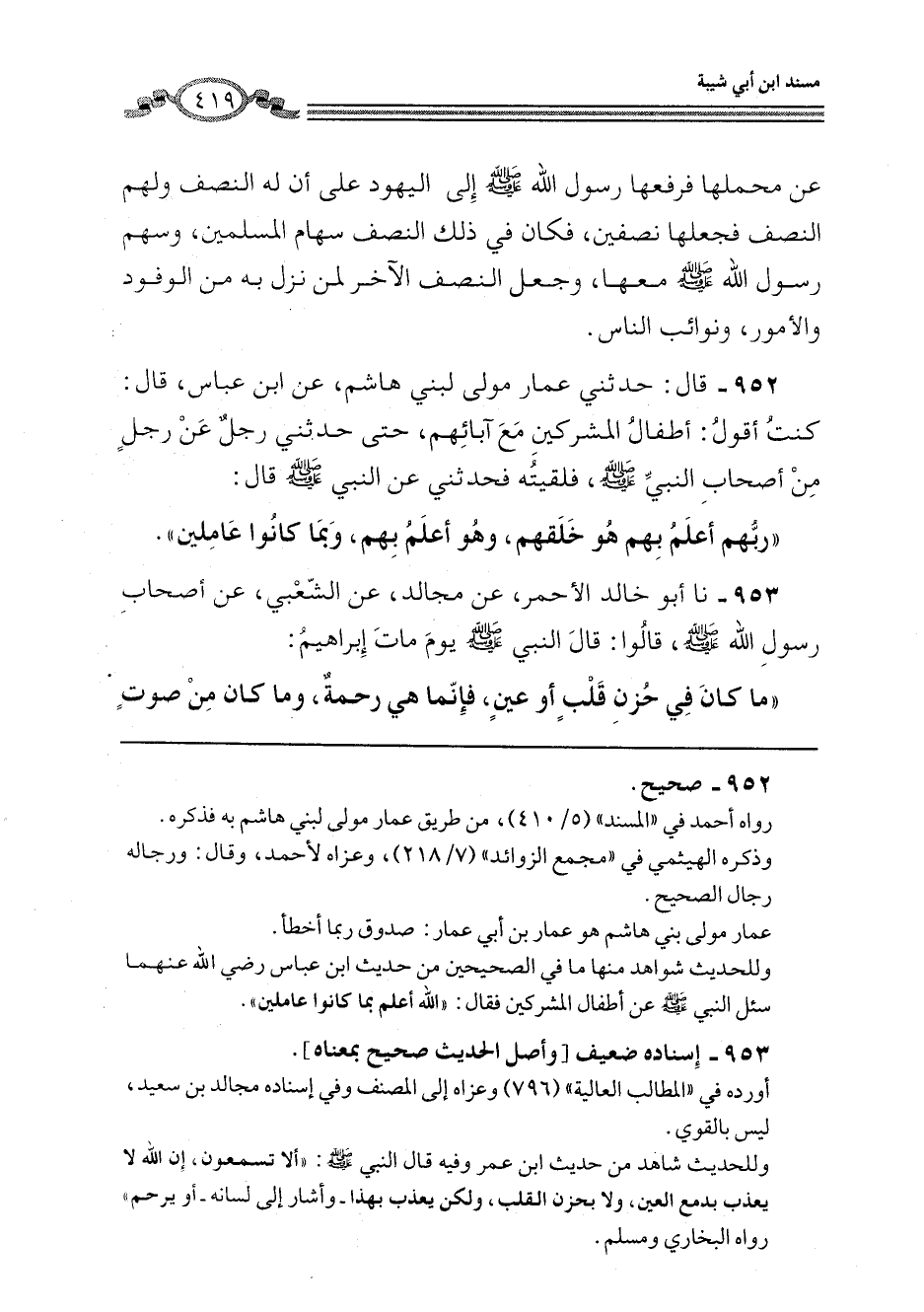 952 - قَالَ: حَدَّثَنِي عَمَّارٌ، مَوْلًى لِبَنِي هَاشِمٍ، عَنِ ابْنِ عَبَّاسٍ، قَالَ: كُنْتُ أَقُولُ: أَطْفَالُ الْمُشْرِكِينَ مَعَ آبَائِهِمْ، حَتَّى حَدَّثَنِي رَجُلٌ، عَنْ رَجُلٍ مِنْ أَصْحَابِ النَّبِيِّ صَلَّى اللهُ عَلَيْهِ وَسَلَّمَ، فَلَقِيتُهُ فَحَدَّثَنِي، عَنِ النَّبِيِّ صَلَّى اللهُ عَلَيْهِ وَسَلَّمَ قَالَ: «§رَبُّهُمْ أَعْلَمُ بِهِمْ هُوَ خَلَقَهُمْ، وَهُوَ أَعْلَمُ بِهِمْ، وَبِمَا كَانُوا عَامِلِينَ»