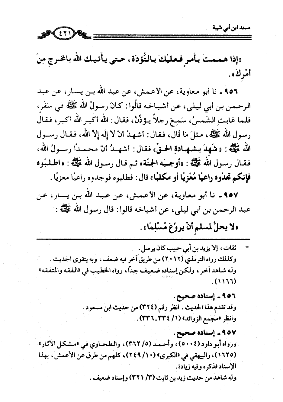 957 - نا أَبُو مُعَاوِيَةَ، عَنِ الْأَعْمَشِ، عَنْ عَبْدِ اللَّهِ بْنِ يَسَارٍ، عَنْ عَبْدِ الرَّحْمَنِ بْنِ أَبِي لَيْلَى، عَنْ أَشْيَاخِهِ، قَالُوا: قَالَ رَسُولُ اللَّهِ صَلَّى اللهُ عَلَيْهِ وَسَلَّمَ: «§لَا يَحِلُّ لِمُسْلِمٍ أَنْ يُرَوِّعَ مُسْلِمًا»
