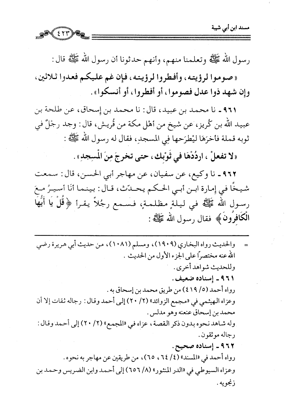 961 - نا مُحَمَّدُ بْنُ عُبَيْدٍ، قَالَ: نا مُحَمَّدُ بْنُ إِسْحَاقَ، عَنْ طَلْحَةَ بْنِ عُبَيْدِ اللَّهِ بْنِ كَرِيزٍ، عَنْ شَيْخٍ، مِنْ أَهْلِ مَكَّةَ مِنْ قُرَيْشٍ، قَالَ: وَجَدَ رَجُلٌ §فِي ثَوْبِهِ قَمْلَةً فَأَخَّرَهَا لِيَطْرَحَهَا فِي الْمَسْجِدِ، فَقَالَ لَهُ رَسُولُ اللَّهِ صَلَّى اللهُ عَلَيْهِ وَسَلَّمَ: «لَا تَفْعَلْ، ارْدُدْهَا فِي ثَوْبِكَ، حَتَّى تَخْرُجَ مِنَ الْمَسْجِدِ»