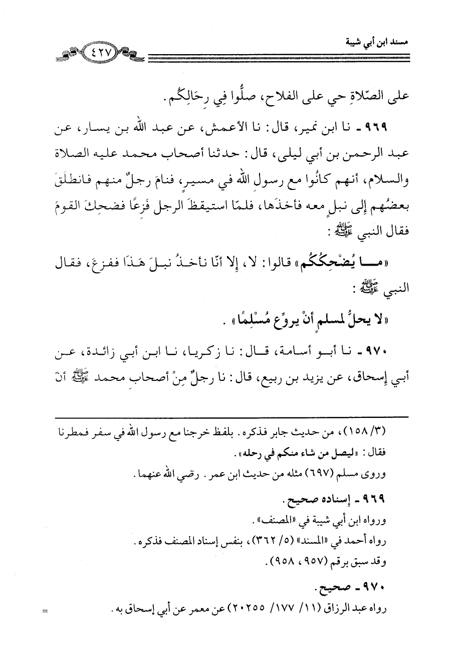 969 - نا ابْنُ نُمَيْرٍ، قَالَ: نا الْأَعْمَشُ، عَنْ عَبْدِ اللَّهِ بْنِ يَسَارٍ، عَنْ عَبْدِ الرَّحْمَنِ بْنِ أَبِي لَيْلَى، قَالَ: حَدَّثَنَا أَصْحَابُ، مُحَمَّدٍ عَلَيْهِ الصَّلَاةُ وَالسَّلَامُ أَنَّهُمْ، كَانُوا مَعَ رَسُولِ اللَّهِ فِي مَسِيرٍ، فَنَامَ رَجُلٌ مِنْهُمْ فَانْطَلَقَ بَعْضُهُمْ إِلَى نَبْلٍ مَعَهُ فَأَخَذَهَا، فَلَمَّا اسْتَيْقَظَ الرَّجُلُ فَزِعًا فَضَحِكَ الْقَوْمُ فَقَالَ النَّبِيُّ صَلَّى اللهُ عَلَيْهِ وَسَلَّمَ: «مَا يُضْحِكُكُمْ؟» قَالُوا: لَا، إِلَّا أَنَّا نَأْخُذُ نَبْلَ هَذَا فَفَزِعَ، فَقَالَ النَّبِيُّ صَلَّى اللهُ عَلَيْهِ وَسَلَّمَ: «§لَا يَحِلُّ لِمُسْلِمٍ أَنْ يُرَوِّعَ مُسْلِمًا»