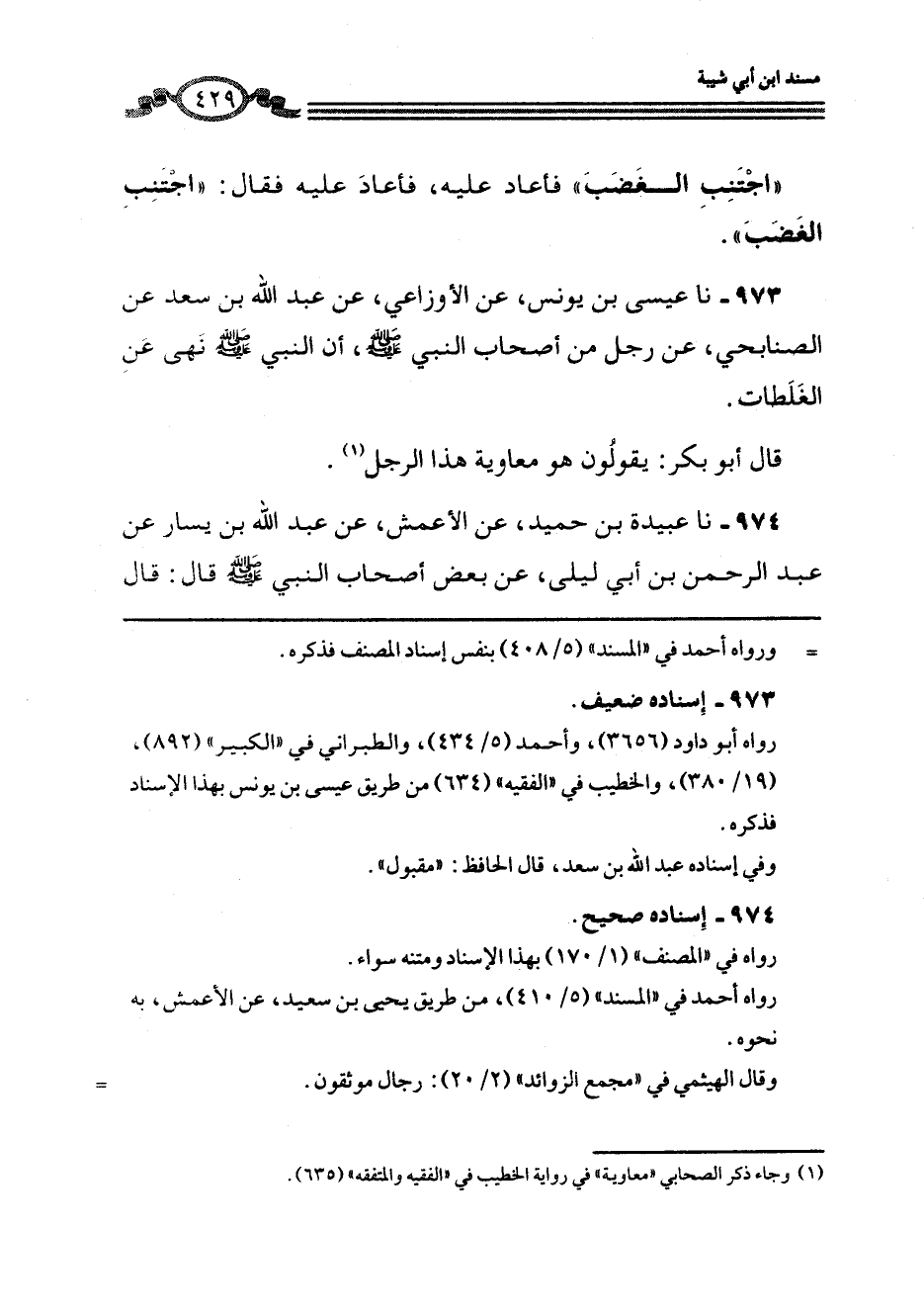 973 - نا عِيسَى بْنُ يُونُسَ، عَنِ الْأَوْزَاعِيِّ، عَنْ عَبْدِ اللَّهِ بْنِ سَعْدٍ، عَنِ الصُّنَابِحِيِّ، عَنْ رَجُلٍ، مِنْ أَصْحَابِ النَّبِيِّ صَلَّى اللهُ عَلَيْهِ وَسَلَّمَ، أَنَّ النَّبِيَّ صَلَّى اللهُ عَلَيْهِ وَسَلَّمَ «§نَهَى عَنِ الْغَلْطَاتِ» ، قَالَ أَبُو بَكْرٍ: يَقُولُونَ هُوَ مُعَاوِيَةُ هَذَا الرَّجُلُ