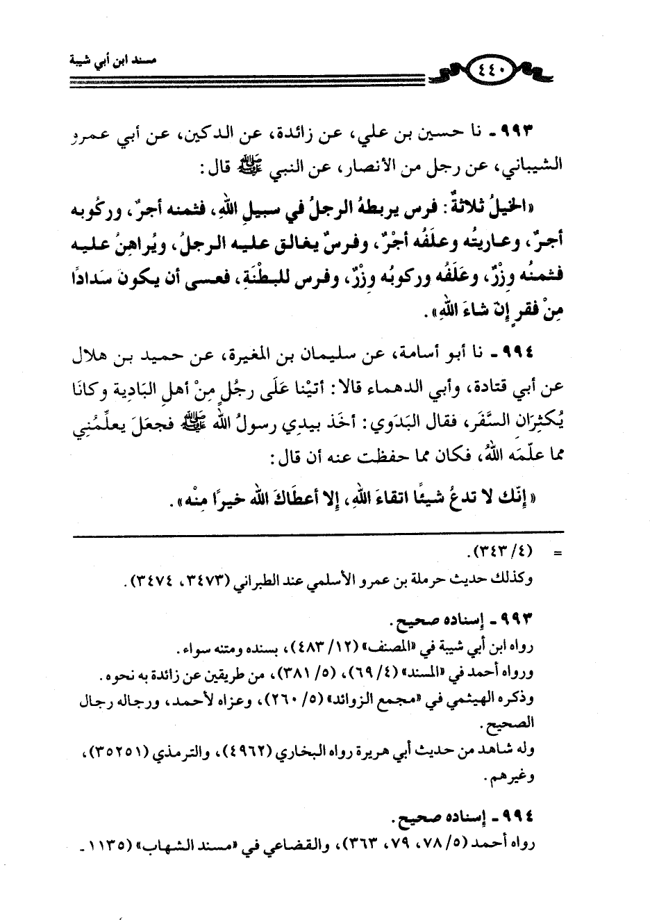 993 - نا حُسَيْنُ بْنُ عَلِيٍّ، عَنْ زَائِدَةَ، عَنِ الدُّكَيْنِ، عَنْ أَبِي عَمْرٍو الشَّيْبَانِيِّ، عَنْ رَجُلٍ، مِنَ الْأَنْصَارِ، عَنِ النَّبِيِّ صَلَّى اللهُ عَلَيْهِ وَسَلَّمَ قَالَ: " §الْخَيْلُ ثَلَاثَةٌ: فَرَسٌ يَرْبِطُهُ الرَّجُلُ فِي سَبِيلِ اللَّهِ، فَثَمَنُهُ أَجْرٌ، وَرُكُوبُهُ أَجْرٌ، وَرِعَايَتُهُ وَعَلَفُهُ أَجْرٌ، وَفَرَسٌ يُغَالِقُ عَلَيْهِ الرَّجُلُ وُيُرَاهِنُ عَلَيْهِ، فَثَمَنُهُ وِزْرٌ، وَعَلَفَهُ وَرُكُوبُهُ وِزْرٌ، وَفَرَسٌ لِلْبِطْنَةِ، فَعَسَى أَنْ يَكُونَ سِدَادًا مِنْ فَقْرٍ إِنْ شَاءَ اللَّهُ "