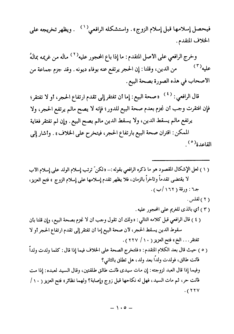 (¬4) قال الرافعي قبل كلامه التالي: "ولك أن تقول وجب أن لا نجزم بصحة البيع، وإِن قلنا بأن سقوط الدين يسقط الحجر؛ لأن صحة البيع إِما أن تفتقر إِلى تقدم ارتفاع الحجر أو لا تفتقر ... الخ " فتح العزيز (10/ 227).