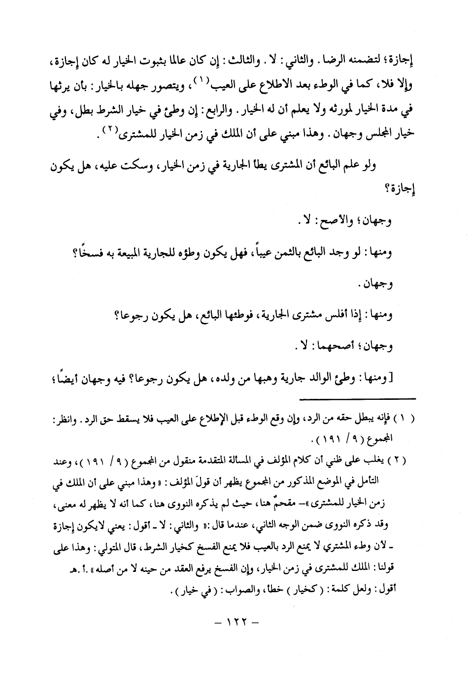 (¬2) يغلب على ظني أن كلام المؤلف في المسألة المتقدمة منقول من المجموع (9/ 191)، وعند التأمل في الموضع المذكور من المجموع يظهر أن قولَ المؤلف: " وهذا مبني على أن الملك في زمن الخيار للمشترى" - مقحمٌ هنا، حيث لم يذكره النووى هنا، كما أنه لا يظهر له معنى، وقد ذكره النووى ضمن الوجه الثاني، عندما قال: "والثاني: لا -أقول: يعني لا يكون إِجازة - لأن وطء المشترى لا يمنع الرد بالعيب فلا يمنع الفسخ كخيار الشرط، قال المتولي: وهذا على قولنا: الملك للمشترى في زمن الخيار، دان الفسخ يرفع العقد من حينه لا من أصله ". أ. هـ