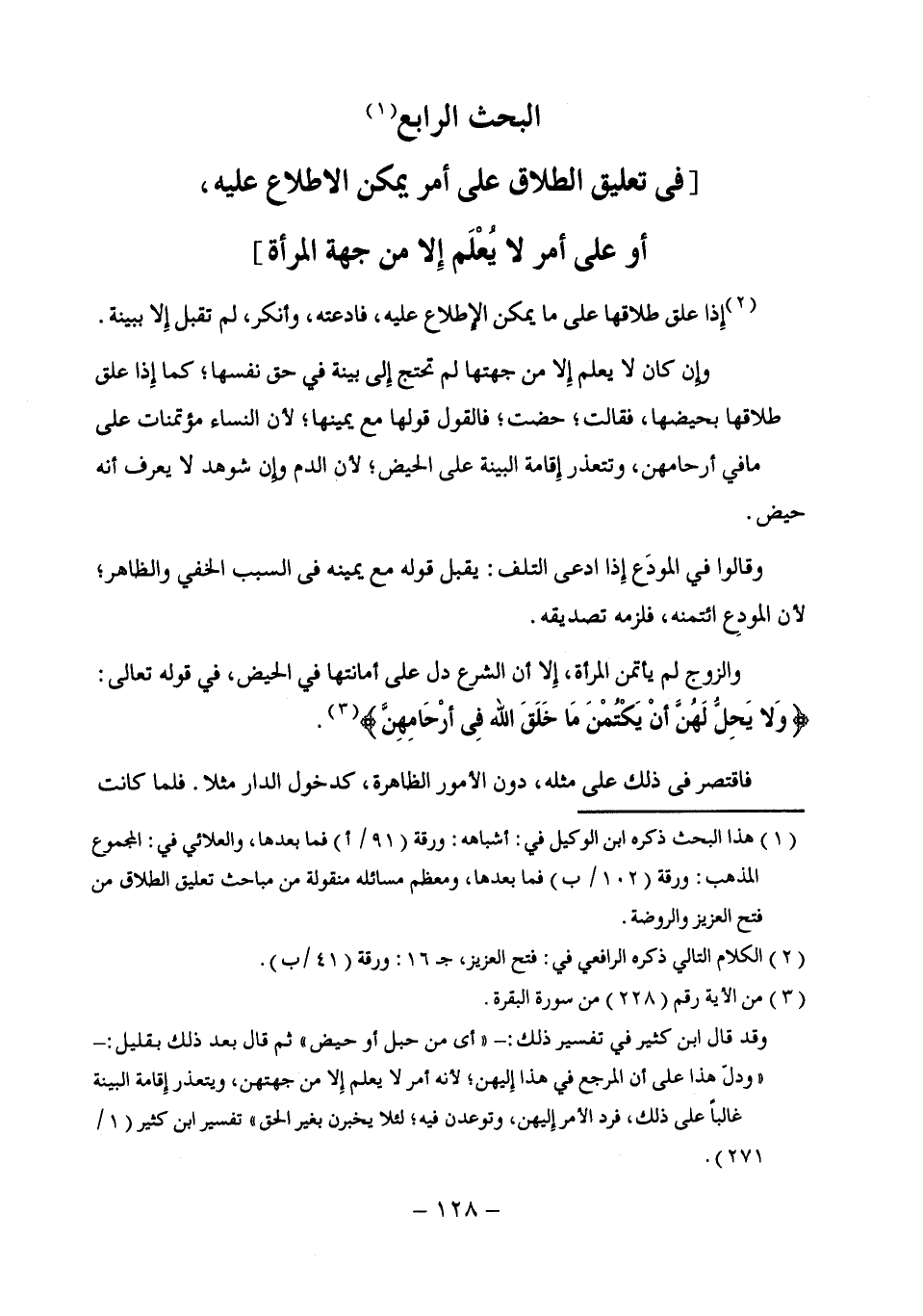 البحث الرابع (¬1) [فى تعليق الطلاق على أمر يمكن الاطلاع عليه، أو على أمر لا يُعْلَم إِلا من جهة المرأة]