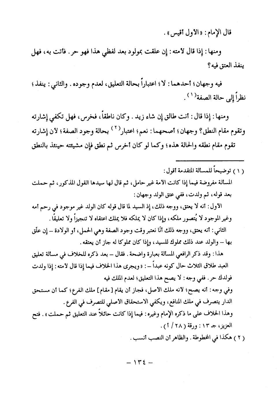 هذا: وقد ذكر الرافعي المسألة بعبارة واضحة. فقال -بعد ذكره للخلاف في مسألة تعليق العبد طلاق الثلاث حال كونه عبداً-: " ويجرى هذا الخلاف فيما إِذا قال لأمته: إِذا ولدت فولدك حر. ففي وجه: لا يصح هذا التعليق؛ لعدم الملك فيه
