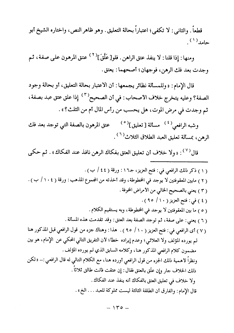 (¬7) أى الرافعي في: فتح العزيز (10/ 95). هذا: وهناك جزء من قول الرافعي قبل المذكور هنا لم يورده المؤلف ولا العلائي، وعدم إِيراده خطأ؛ لأن التفريق التالي المحكي عن الإِمام، هو بين مضمون كلام الرافعي المذكور هنا، وكلامه السابق الذي لم يورده المؤلف.