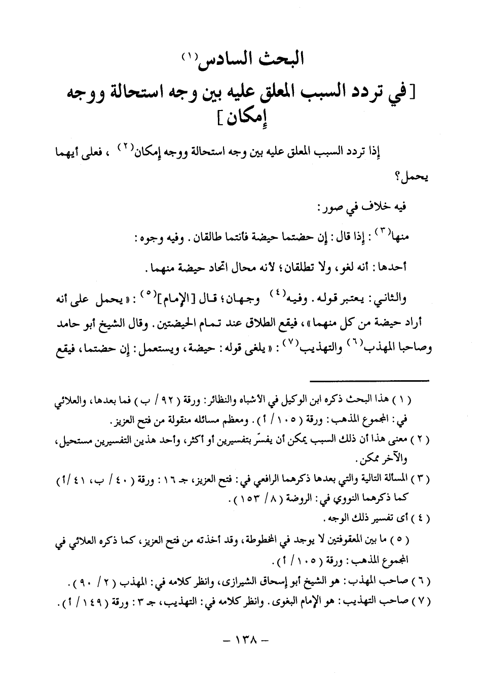 البحث السادس (¬1) [في تردد السبب المعلق عليه بين وجه استحالة ووجه إِمكان]