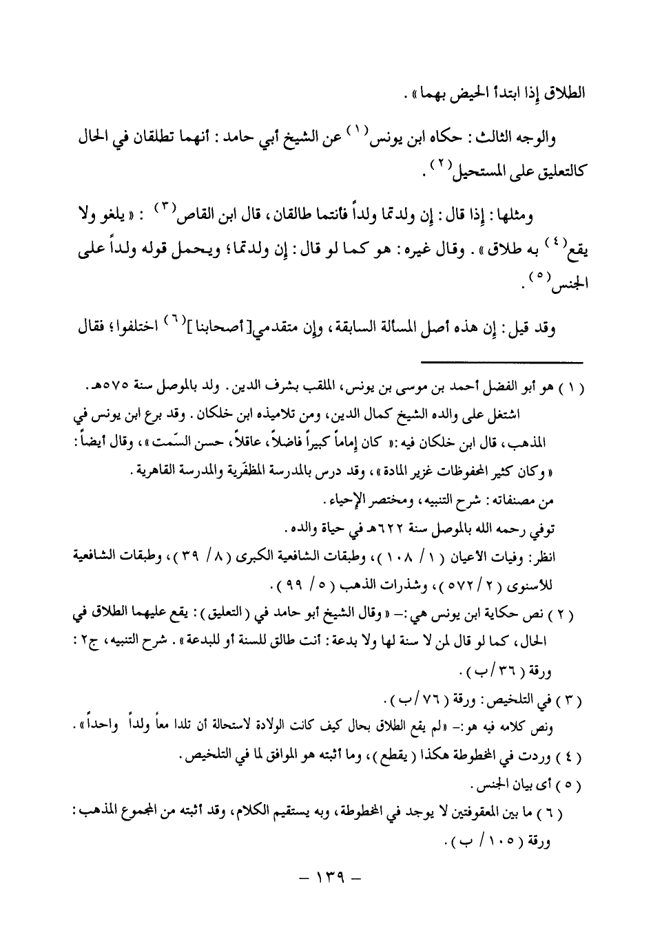 (¬2) نص حكاية ابن يونس هي: - " وقال الشيخ أبو حامد في (التعليق): يقع عليهما الطلاق في الحال، كما لو قال لمن لا سنة لها ولا بدعة: أنت طالق للسنة أو للبدعة ". شرح التنبيه، ج 2: ورقة (36 / ب).