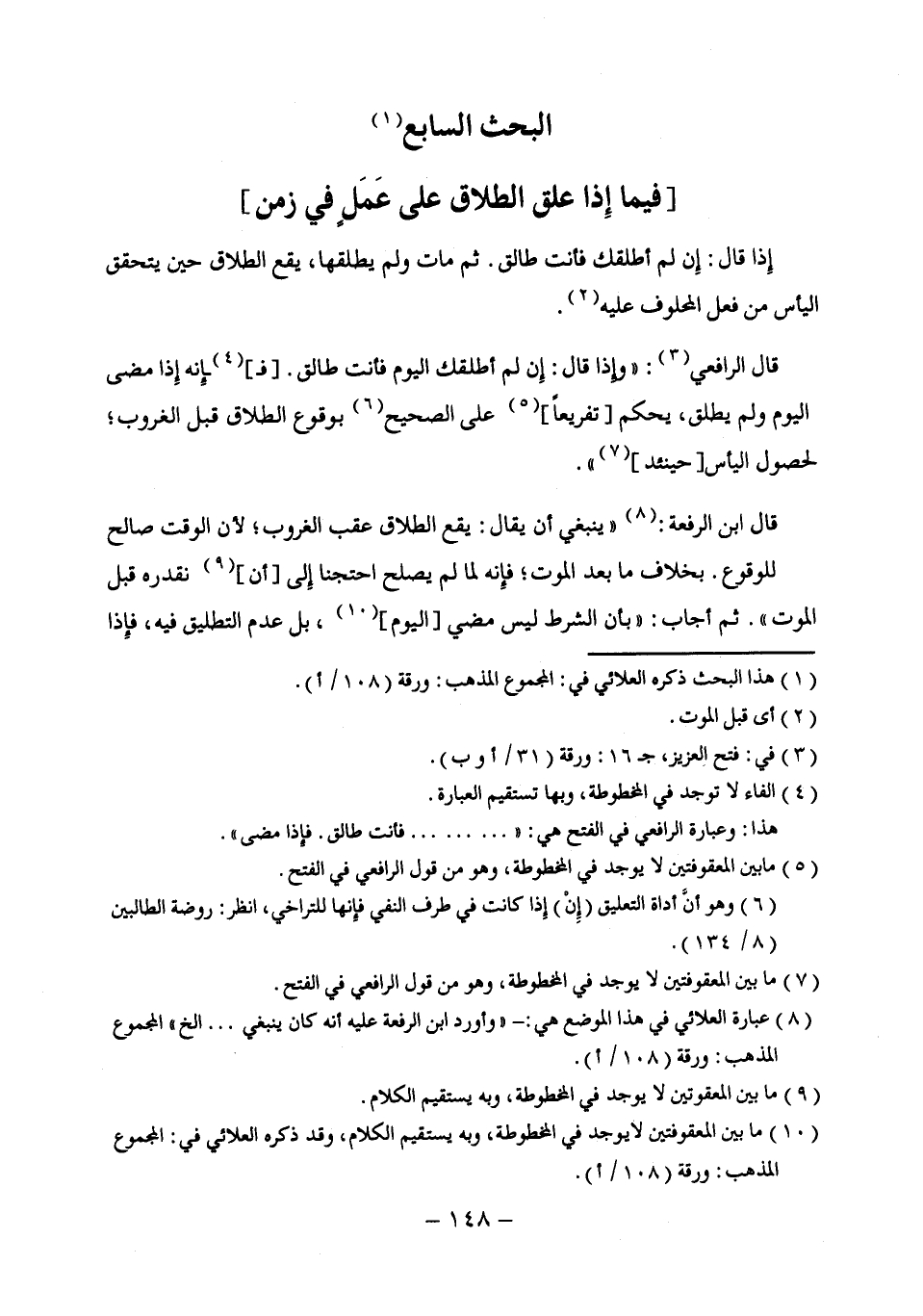 (¬6) وهو أنَّ أداة التعليق (إِنْ) إِذا كانت في طرف النفي فإِنها للتراخي، انظر: روضة الطالبين (8/ 134).