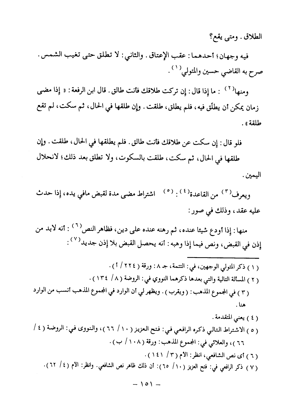 (¬5) الاشتراط التالي ذكره الرافعي في: فتح العزيز (10/ 66)، والنووى في: الروضة (4/ 66)، والعلائي في: المجموع المذهب: ورقة (108 / ب).