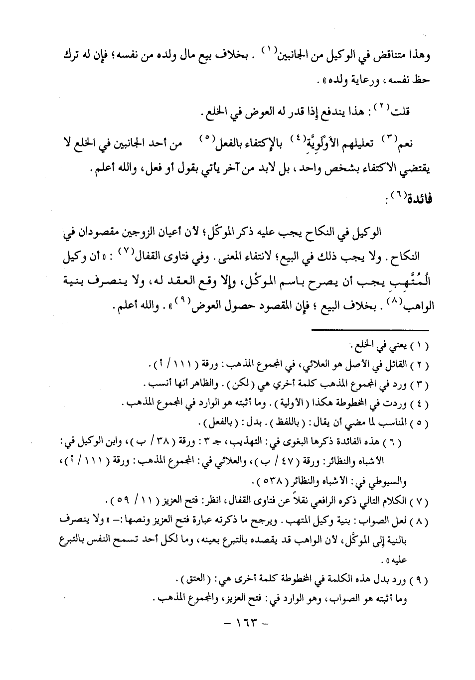 (¬6) هذه الفائدة ذكرها البغوى في: التهذيب، جـ 3: ورقة (38/ ب)، وابن الوكيل فى: الأشباه والنظائر: ورقة (47/ ب)، والعلائي في: المجموع المذهب: ورقة (111/ أ)، والسيوطي في: الأشباه والنظائر (538).