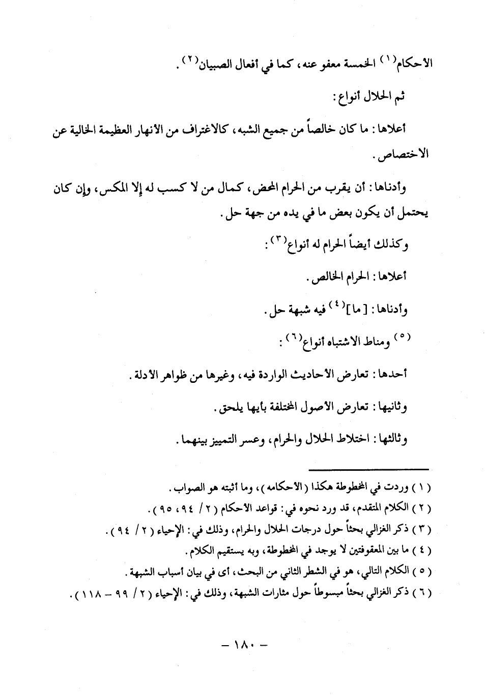 (¬6) ذكر الغزالي بحثاً مبسوطاً حول مثارات الشبهة، وذلك في: الإِحياء (2/ 99 - 118).