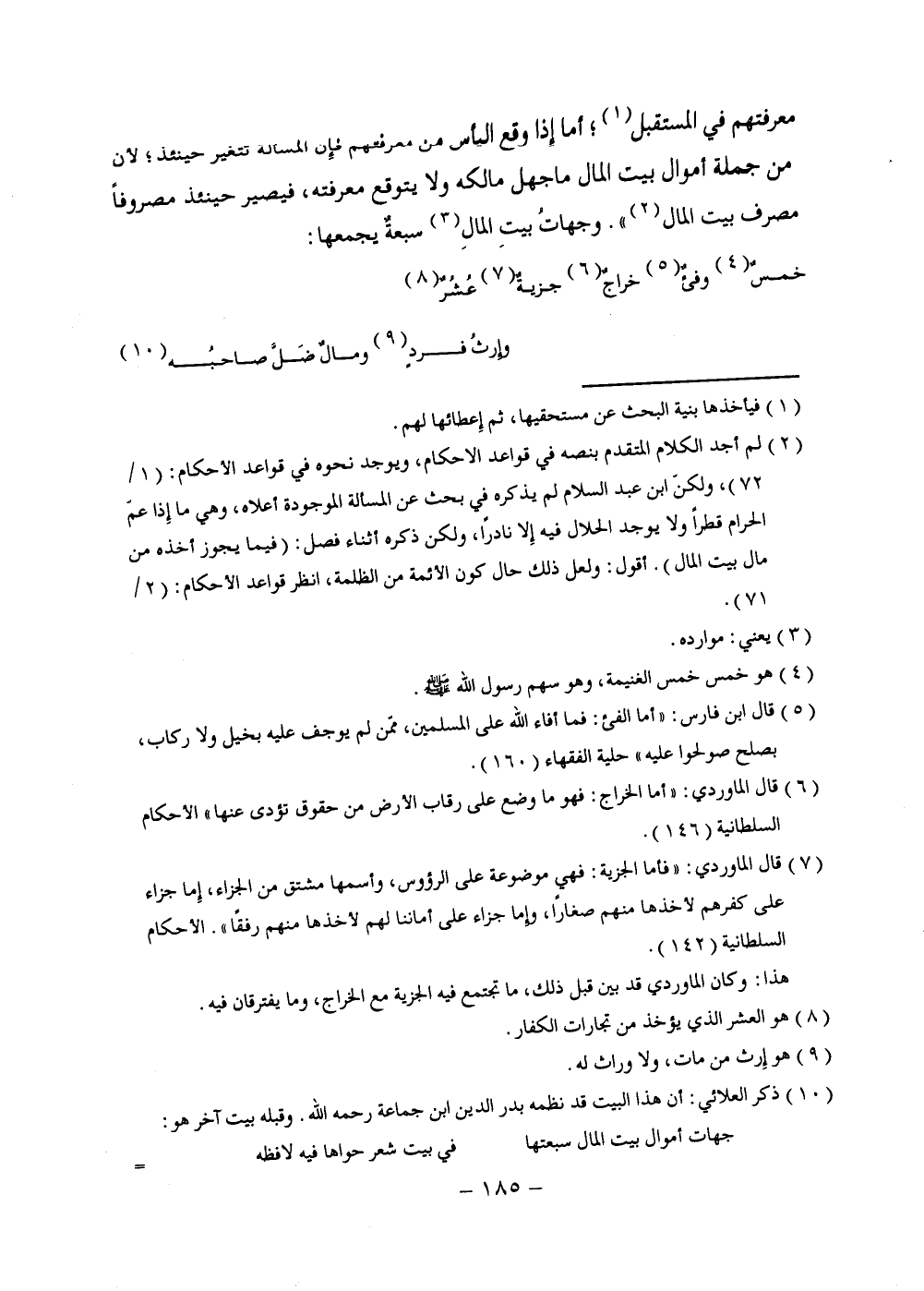 خمسٌ (¬4) وفئٌ (¬5) خراجٌ (¬6) جزية (¬7) عُشُرٌ (¬8) ... وإِرثُ فردٍ (¬9) ومالٌ ضَلَّ صاحبُه (¬10)