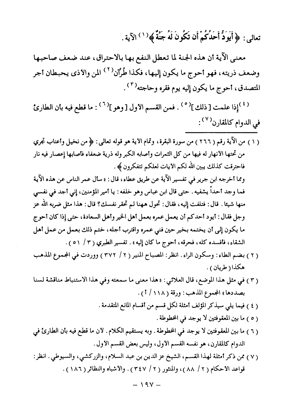 (¬4) إِذا علمت [ذلك] (¬5). فمن القسم الأول [وهو] (¬6): ما قطع فيه بأن الطارئ في الدوام كالمقارن (¬7):