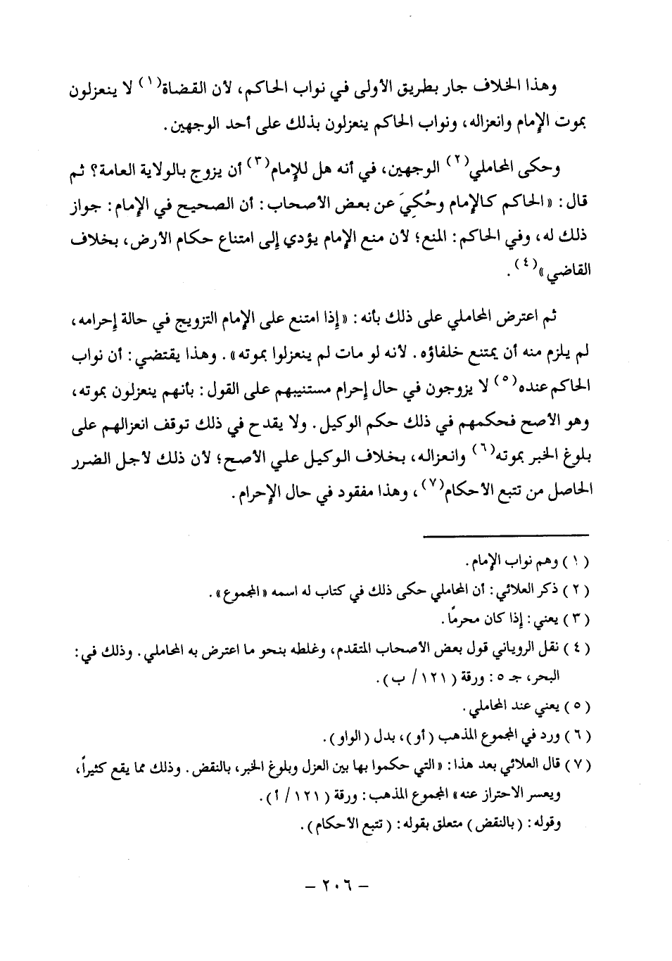 ثم اعترض المحاملي على ذلك بأنه: "إِذا امتنع على الإِمام التزويج في حالة إِحرامه؛ لم يلزم منه أن يمتنع خلفاؤه. لأنه لو مات لم ينعزلوا بموته". وهذا يقتضي: أن نواب الحاكم عنده (¬5) لا يزوجون في حال إِحرام مستنيبهم على القول: بأنهم ينعزلون بموته، وهو الأصح فحكمهم في ذلك حكم الوكيل. ولا يقدح في ذلك توقف انعزالهم على بلوغ الخبر بموته (¬6) وانعزاله، بخلاف الوكيل على الأصح؛ لأن ذلك لأجل الضرر الحاصل من تتبع الأحكام (¬7)، وهذا مفقود في حال الإِحرام.