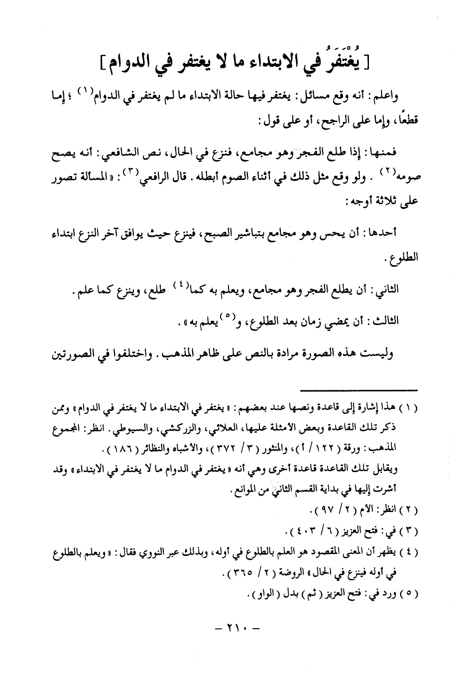 (¬1) هذا إِشارة إِلى قاعدة ونصها عند بعضهم: "يغتفر في الابتداء ما لا يغتفر في الدوام" وممن ذكر تلك القاعدة وبعض الأمثلة عليها، العلائي، والزركشي، والسيوطي. انظر: المجموع المذهب: ورقة (122/ أ)، والمنثور (3/ 372)، والأشباه والنظائر (186).