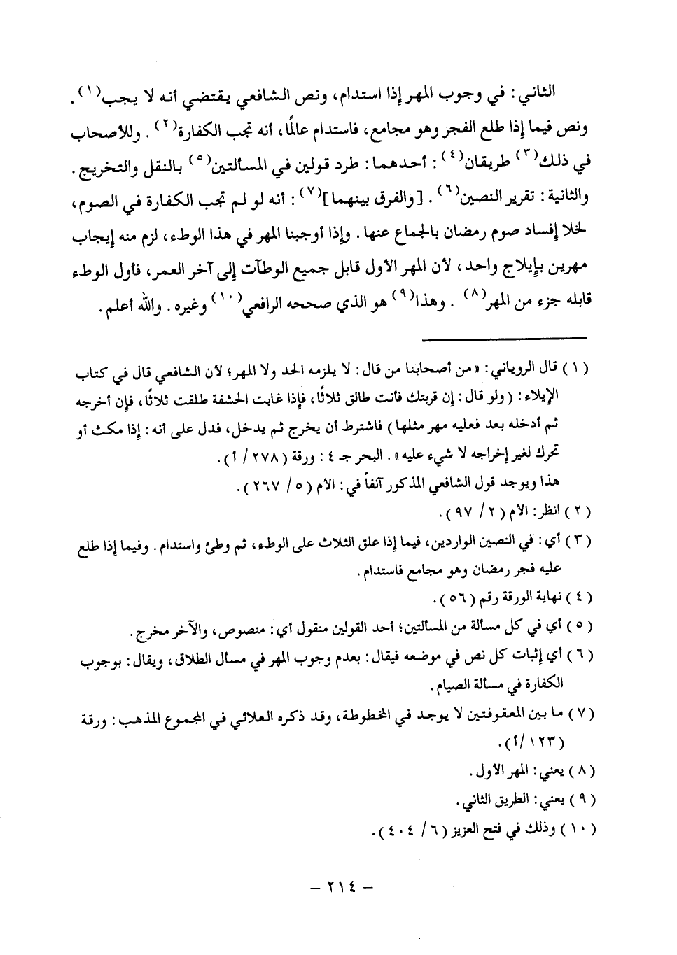 الثاني: في وجوب المهر إِذا استدام، ونص الشافعي يقتضي أنه لا يجب (¬1). ونص فيما إِذا طلع الفجر وهو مجامع، فاستدام عالمًا، أنه تجب الكفارة (¬2). وللأصحاب في ذلك (¬3) طريقان (¬4): أحدهما: طرد قولين في المسألتين (¬5) بالنقل والتخريج. والثانية: تقرير النصين (¬6). [والفرق بينهما] (¬7): أنه لو لم تجب الكفارة في الصوم؛ لخلا إِفساد صوم رمضان بالجماع عنها. وإِذا أوجبنا المهر في هذا الوطء؛ لزم منه إِيجاب مهرين بإِيلاج واحد؛ لأن المهر الأول قابل جميع الوطآت إِلى آخر العمر، فأول الوطء قابله جزء من المهر (¬8). وهذا (¬9) هو الذي صححه الرافعي (¬10) وغيره. والله أعلم.