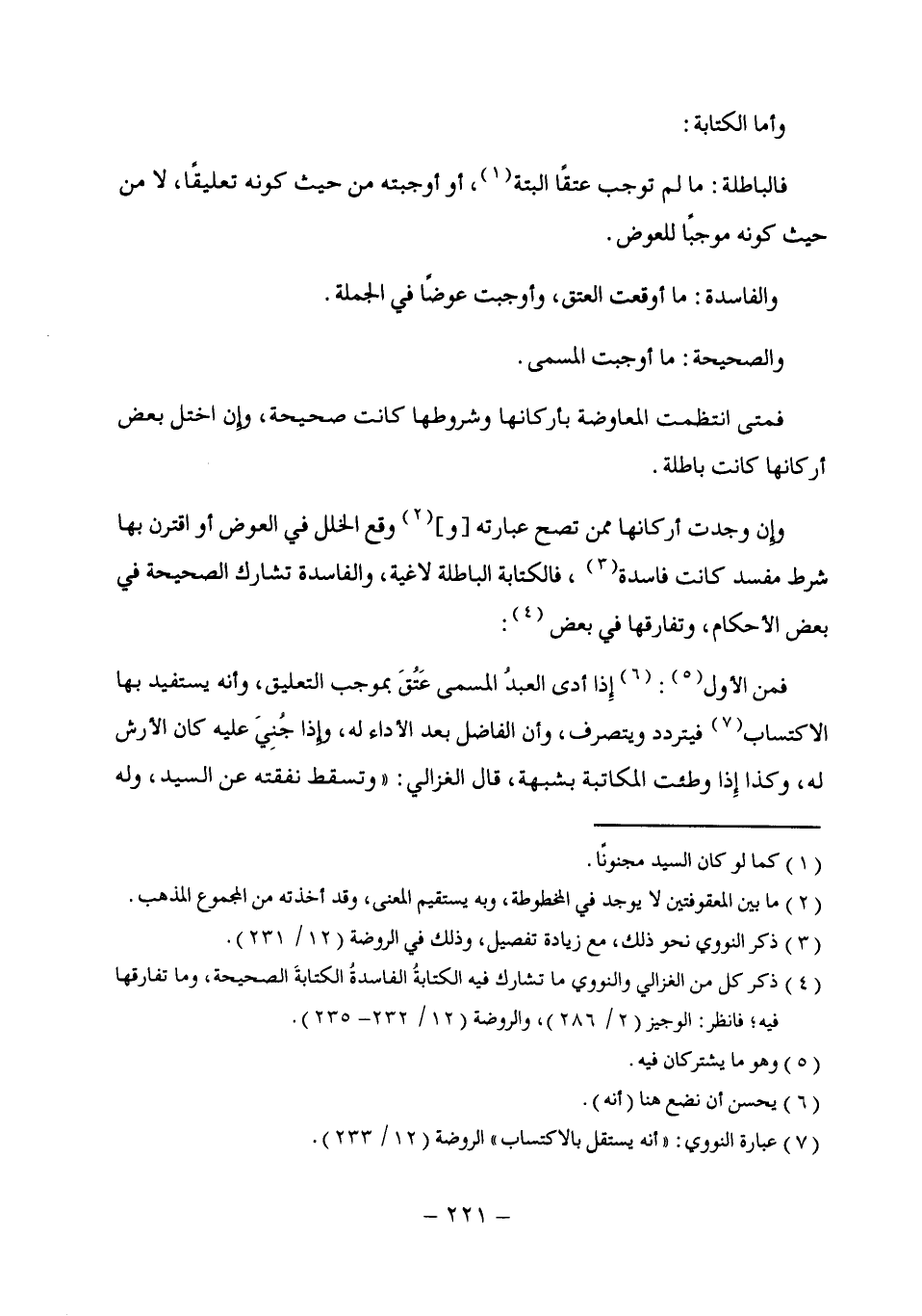 (¬4) ذكر كل من الغزالي والنووي ما تشارك فيه الكتابةُ الفاسدةُ الكتابةَ الصحيحة، وما تفارقها فيه، فانظر: الوجيز (2/ 286)، والروضة (12/ 232 - 235).