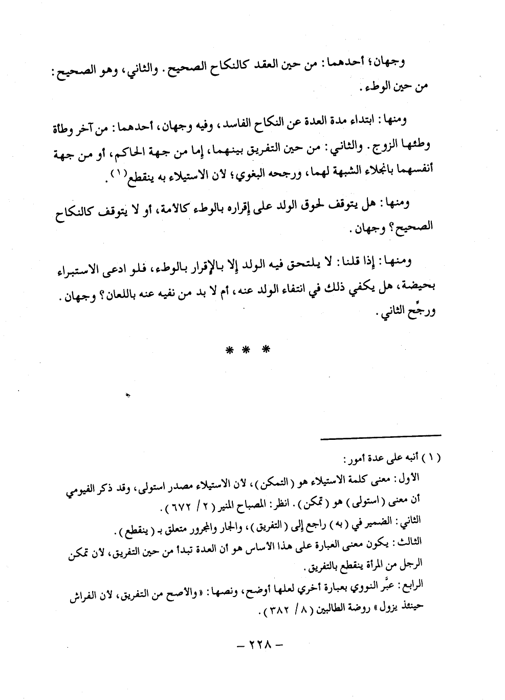 ومنها: ابتداء مدة العدة عن النكاح الفاسد، وفيه وجهان، أحدهما: من آخر وطأة وطئها الزوج. والثاني: من حين التفريق بينهما، إما من جهة الحاكم، أو من جهة أنفسهما بانجلاء الشبهة لهما، ورجحه البغوى؛ لأن الاستيلاء به ينقطع (¬1).