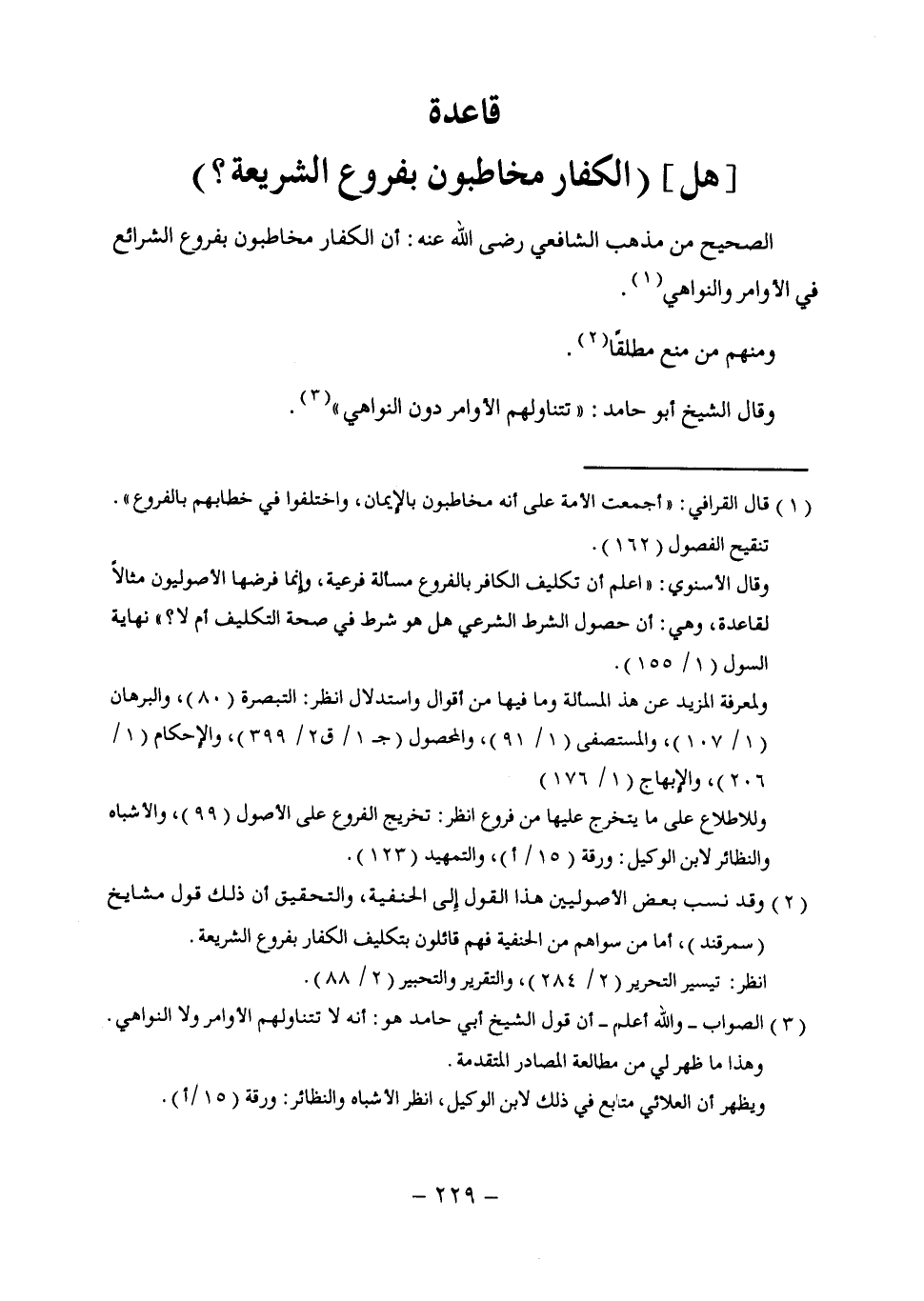 (¬2) وقد نسب بعض الأصوليين هذا القول إلى الحنفية، والتحقيق أن ذلك قول مشايخ (سمرقند)، أما من سواهم من الحنفية فهم قائلون بتكليف الكفار بفروع الشريعة.