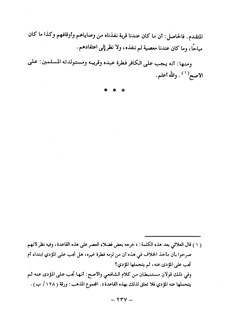 (¬1) قال العلائي بعد هذه الكلمة: "خرجه بعض فضلاء العصر على هذه القاعدة، وفيه نظر لأنهم صرحوا بأن مأخذ الخلاف في هذه أن من لزمه فطرة غيره، هل تجب على المؤدى ابتداء أم تجب على المؤدى عنه، ثم يتحملها المؤدى؟