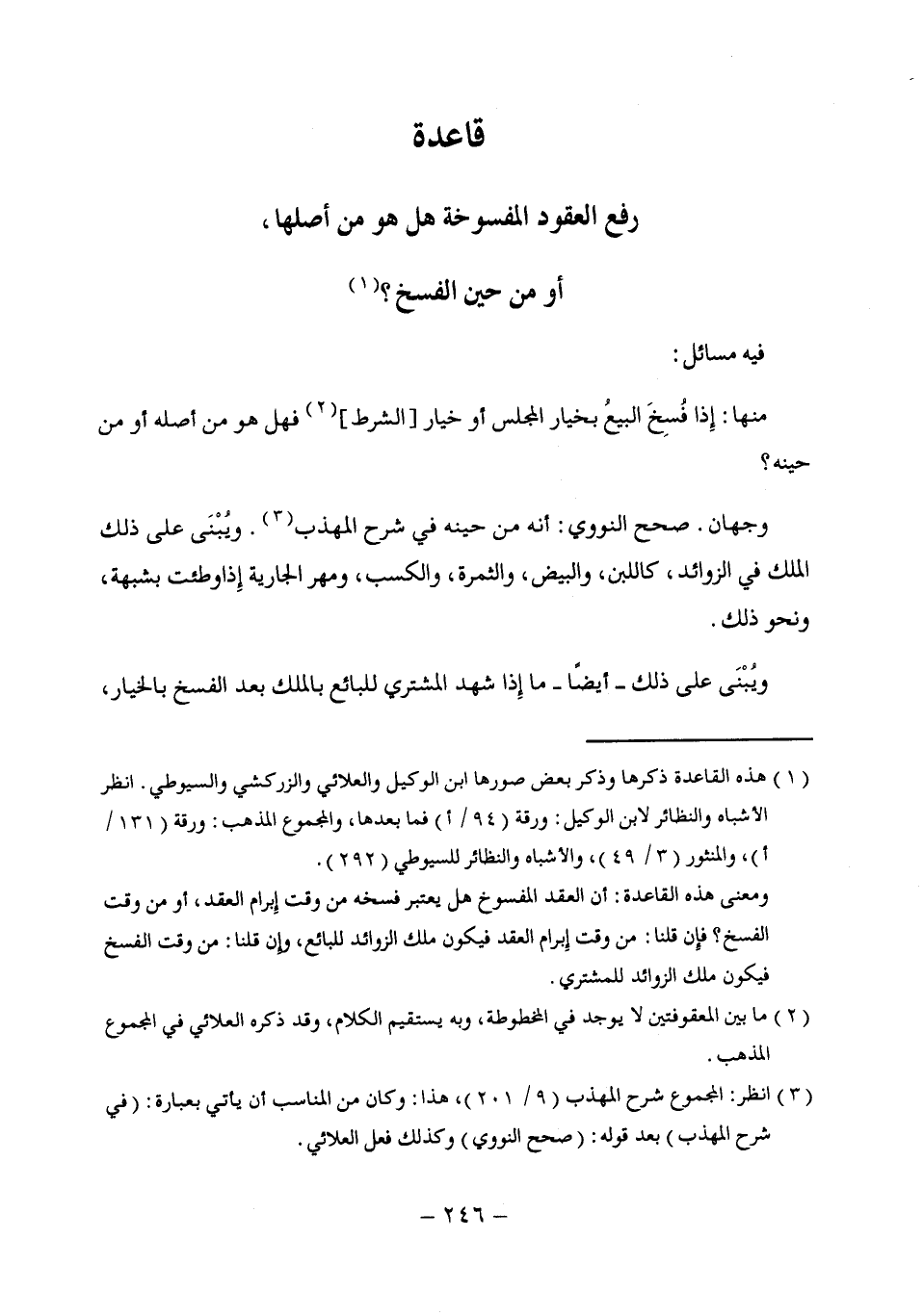 ومعنى هذه القاعدة: أن العقد المفسوخ هل يعتبر فسخه من وقت إِبرام العقد، أو من وقت الفسخ؟ فإِن قلنا: من وقت إبرام العقد فيكون ملك الزوائد للبائع، وإن قلنا: من وقت الفسخ فيكون ملك الزوائد للمشترى.