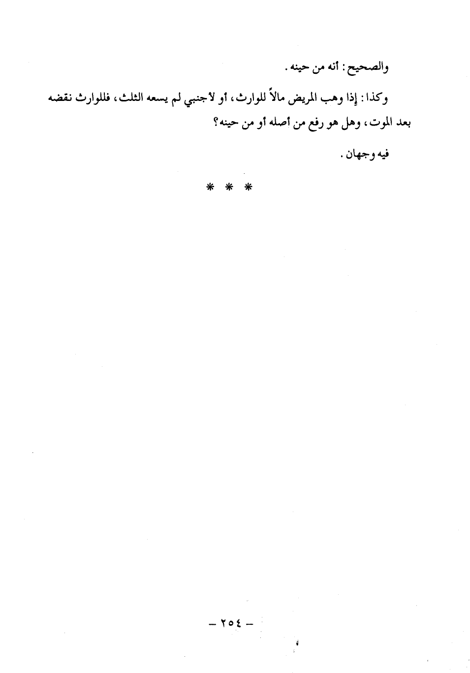 وكذا: إِذا وهب المريض مالًا للوارث، أو لأجنبي لم يسعه الثك، فللوارث نقضه بعد الموت، وهل هو رفع من أصله أو من حينه؟