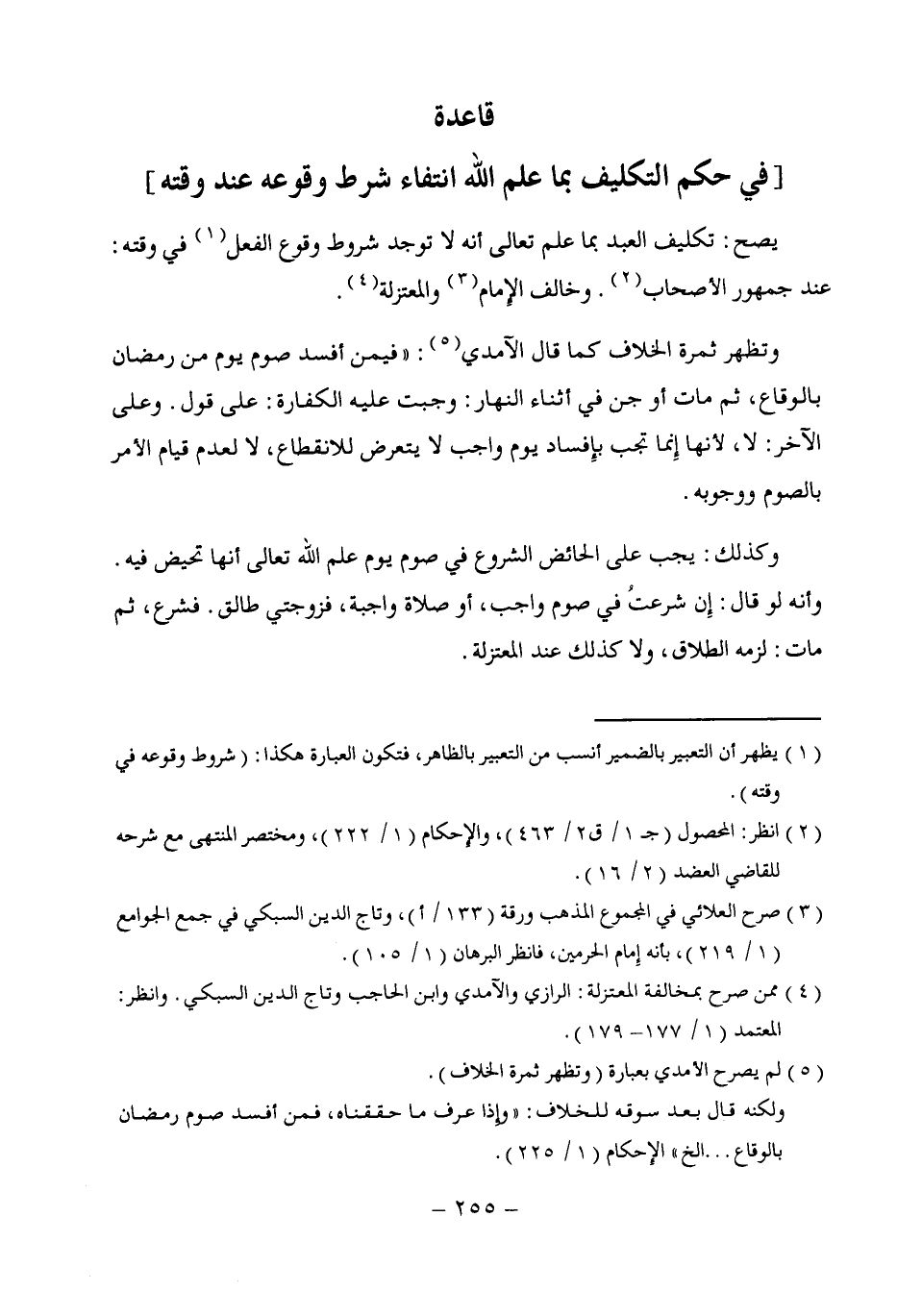 (¬1) يظهر أن التعبير بالضمير أنسب من التعبير بالظاهر، فتكون العبارة هكذا: (شروط وقوعه في وقته).