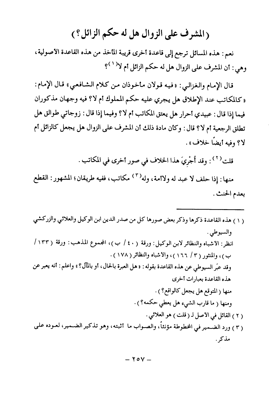 نعم: هذه المسائل ترجع إِلى قاعدة أخرى قريبة المأخذ من هذه القاعدة الأصولية، وهي: أن المشرف على الزوال هل له حكم الزائل أم لا (¬1)؟