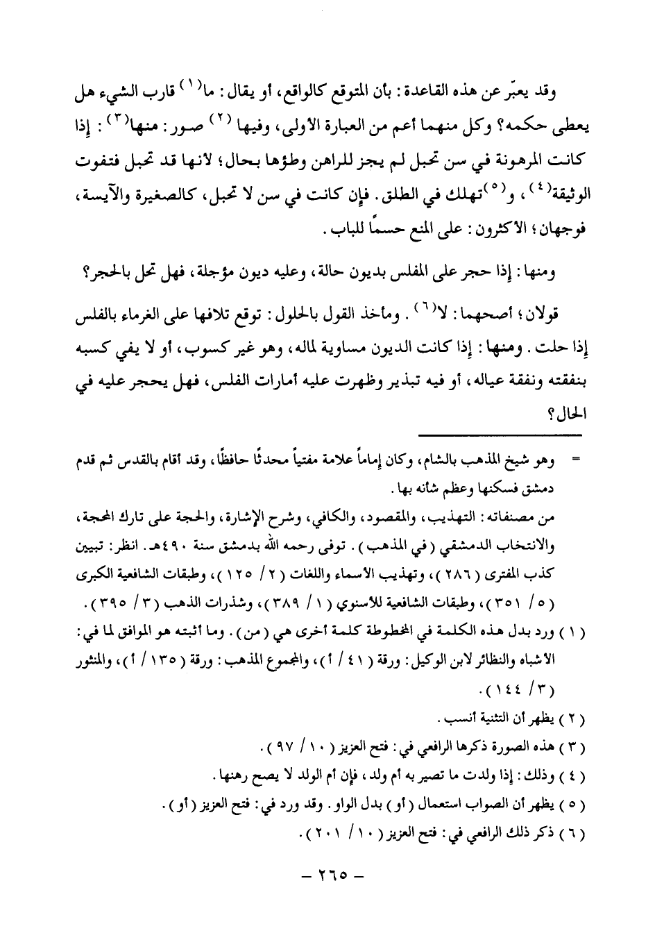 (¬1) ورد بدل هذه الكلمة في المخطوطة كلمة أخرى هي (من). وما أثبته هو الموافق لما في: الأشباه والنظائر لابن الوكيل: ورقة (41 / أ)، والمجموع المذهب: ورقة (135 / أ)، والمنثور (3/ 144).