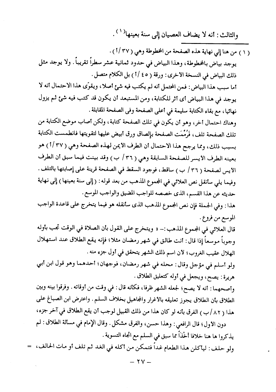 وهناك احتمال أخر، وهو أن يكون في تلك الصفحة كتابة، ولكن أصاب موضع الكتابة من تلك الصفحة تلف، فَرُمِّمّت الصفحة بإِلصاق ورق أبيض عليها لتقريتها فانطمست الكتابة بسبب ذلك، ومما يرجح هذا الاحتمال أن الطرف الأيمن لهذه الصفحة وهي (37 / أ) هو بعينه الطرف الأيسر للصفحة السابقة وهي (36 / ب) وقد بينت فيما سبق أن الطرف الأيس لصفحة (36 / ب) ساقط، فوجود السقط في الصفحة قرينة على إصابتها بالتلف. وفيما يلي سأنقل نص العلائي في المجموع المذهب من بعد قوله: (إلى سنة بعينها) إِلى نهاية حديثه عن هذا القسم، الذى خصصه للواجب المضيق والواجب الموسع.