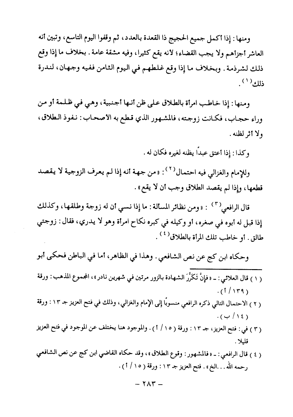 (¬4) قال الرافعي: "فالمشهور: وقوع الطلاق"، وقد حكاه القاضي ابن كج عن نص الشافعي رحمه الله ... الخ". فتح العزيز ج 13: ورقة (15 / أ).