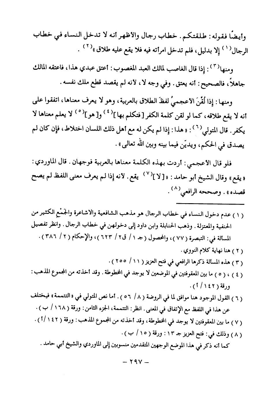 (¬1) عدم دخول النساء في خطاب الرجال هو مذهب الشافعية والأشاعرة والجَمْع الكثير من الحنفية والمعتزلة. وذهب الحنابلة وابن داود إلى دخولهن في خطاب الرجال. وانظر تفصيل المسألة في: التبصرة (77)، والمحصول (ج 1 / ق 2/ 623)، والإحكام (2/ 386).
