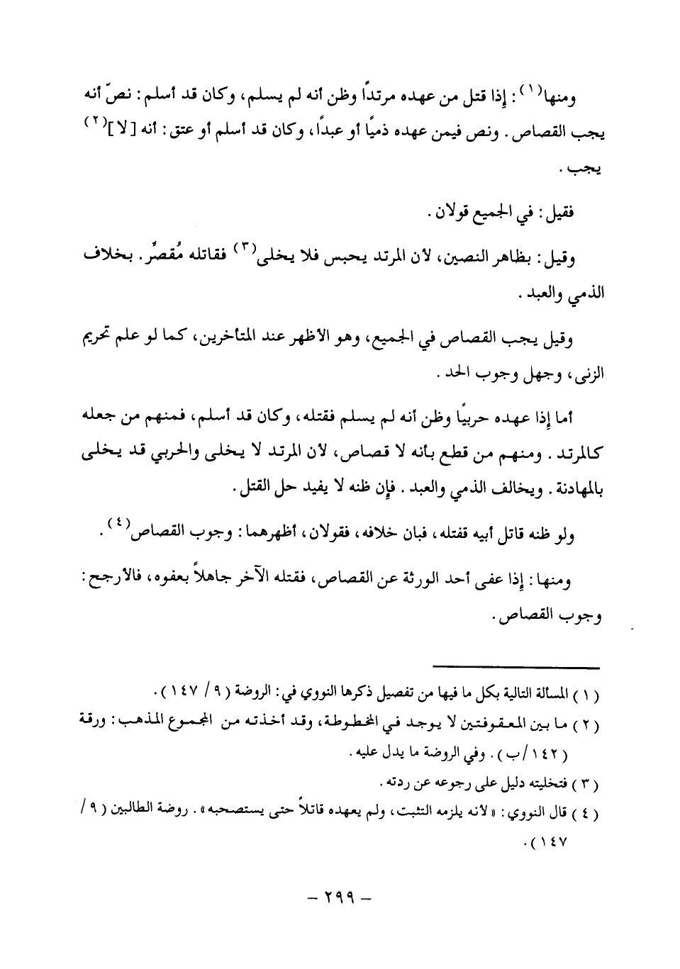 (¬1) المسألة التالية بكل ما فيها من تفصيل ذكرها النووي في: الروضة (9/ 147).