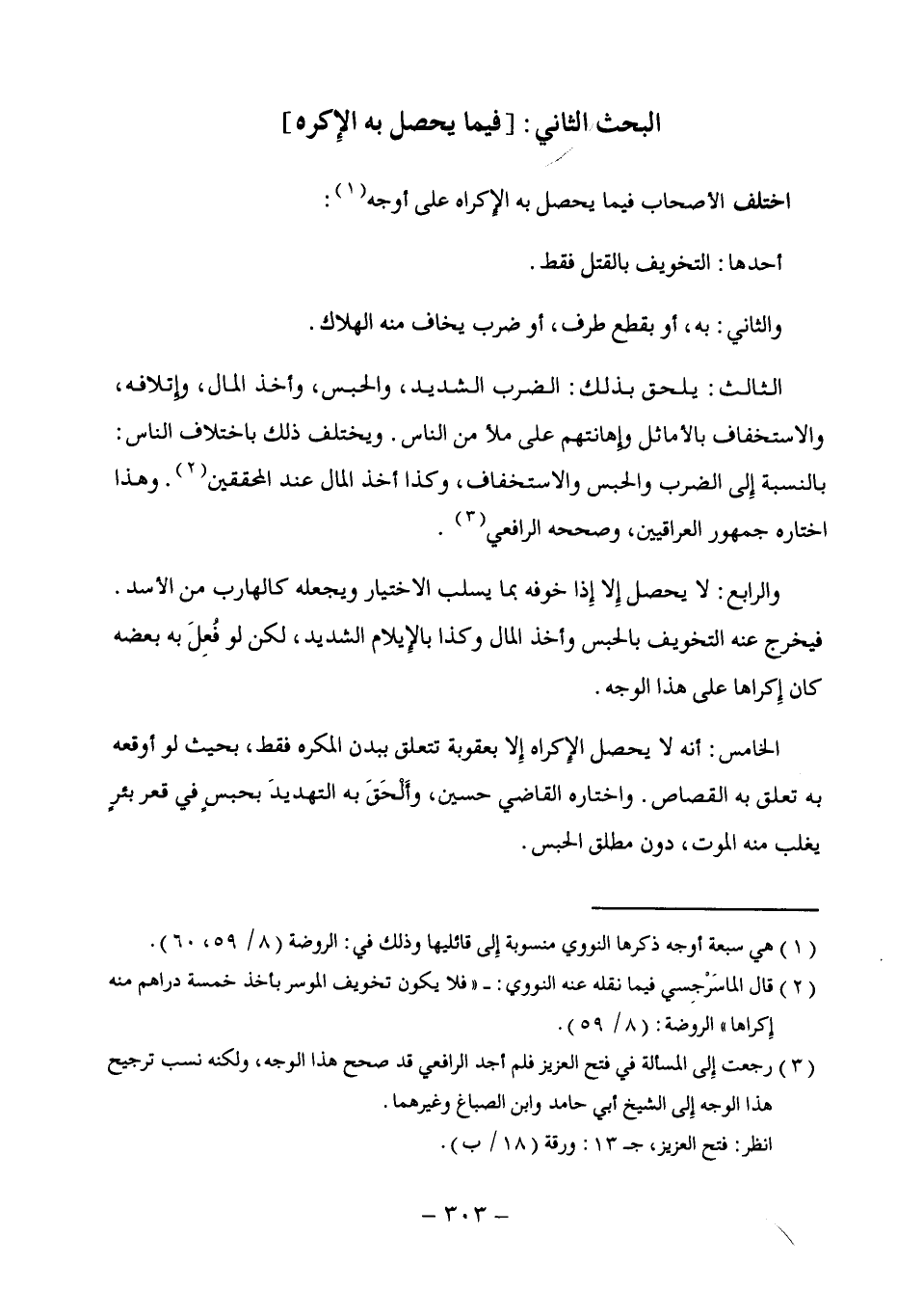 والرابع: لا يحصل إِلا إِذا خوفه بما يسلب الاختيار ويجعله كالهارب من الأسد. فيخرج عنه التخويف بالحبس وأخذ المال وكذا بالإِيلام الشديد؛ لكن لو فُعِلَ به بعضه كان إِكراها على هذا الوجه.