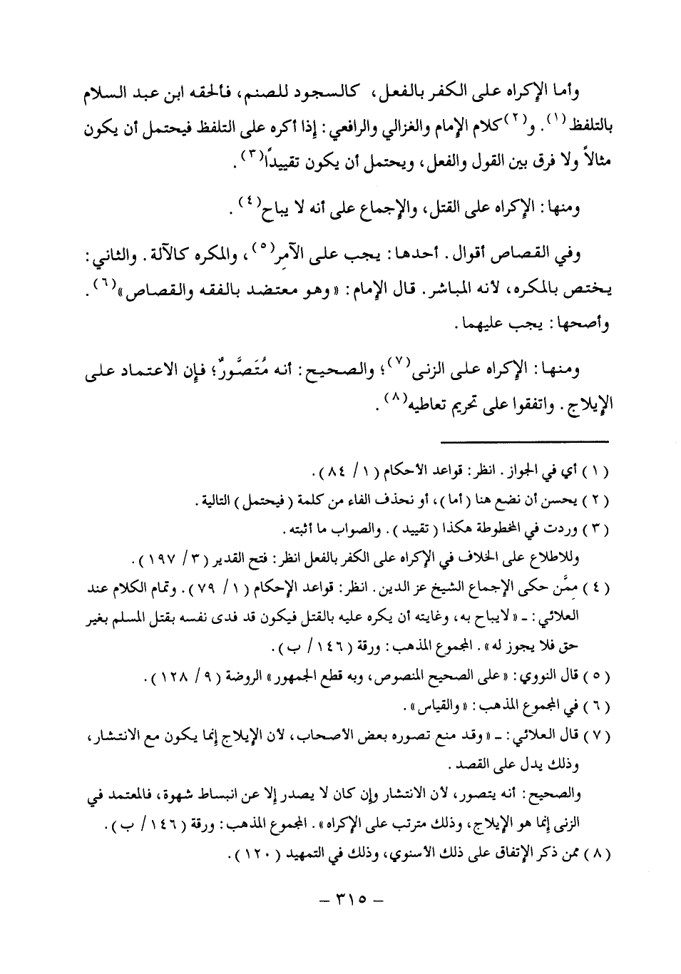 (¬4) مِمَّن حكى الإجماع الشيخ عز الدين. انظر: قواعد الإحكام (1/ 79). وتمام الكلام عند العلائي: - "لا يباح به، وغايته أن يكره عليه بالقتل فيكون قد فدى نفسه بقتل المسلم بغير حق فلا يجوز له". المجموع المذهب: ورقة (146 / ب).