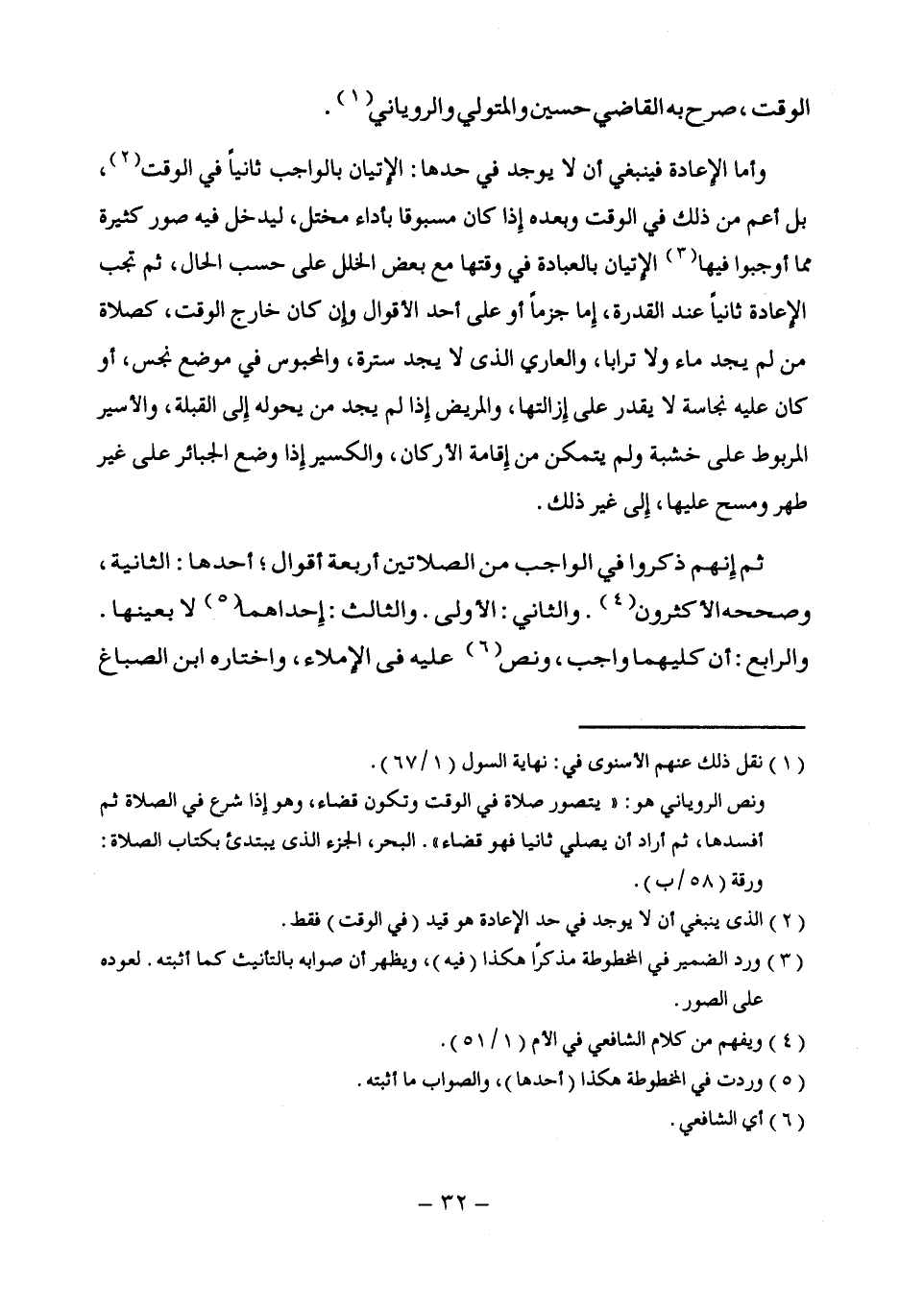 ونص الروياني هو: "يتصور صلاة في الوقت وتكون قضاء، وهو إذا شرع في الصلاة ثم أفسدها، ثم أراد أن يصلي ثانيا فهو قضاء". البحر، الجزء الذى يبتدئ بكتاب الصلاة: ورقة (58 / ب).