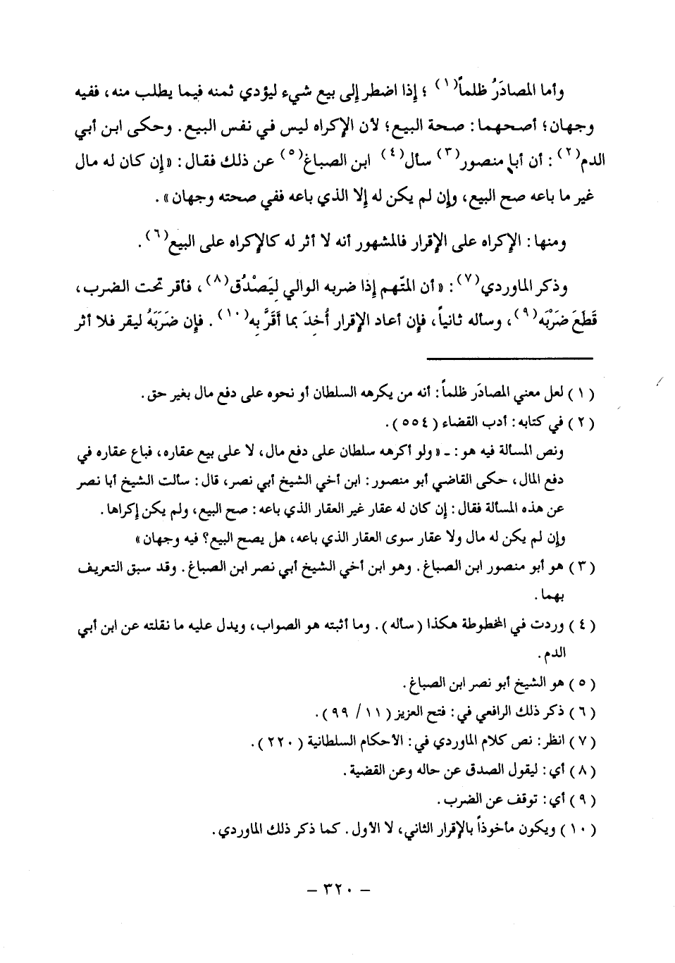 ونص المسألة فيه هو: - "ولو أكرهه سلطان على دفع مال؛ لا على بيع عقاره، فباع عقاره في دفع المال، حكى القاضي أبو منصور: ابن أخي الشيخ أبي نصر، قال: سألت الشيخ أبا نصر عن هذه المسألة فقال: إن كان له عقار غير العقار الذى باعه: صح البيع، ولم يكن إكراها.