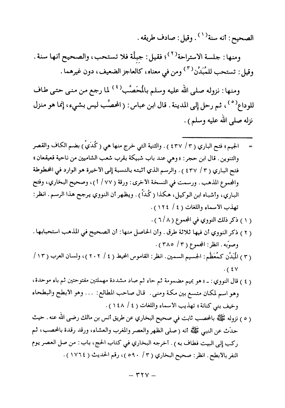 (¬4) قال النووى: - "هو بميم مضمومة ثم حاء ثم صاد مشددة مهملتين مفتوحتين ثم باء موحدة، وهو اسم لمكان متسع بين مكة ومنى. قال صاحب المطالع: ... وهو الأبطح والبطحاء وخيف بني كنانة" تهذيب الأسماء واللغات (4/ 148).