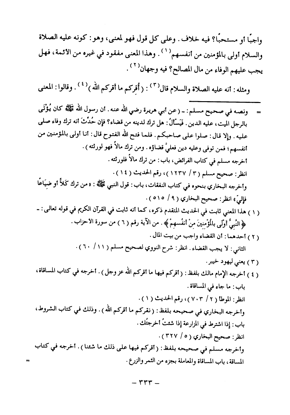 (¬1) هذا المعني ثابت في الحديث المتقدم ذكره، كما أنه ثابت في القرآن الكريم في قوله تعالى: - {النَّبِيُّ أَوْلَى بِالْمُؤْمِنِينَ مِنْ أَنْفُسِهِمْ}. من الآية رقم (6) من سورة الأحزاب.