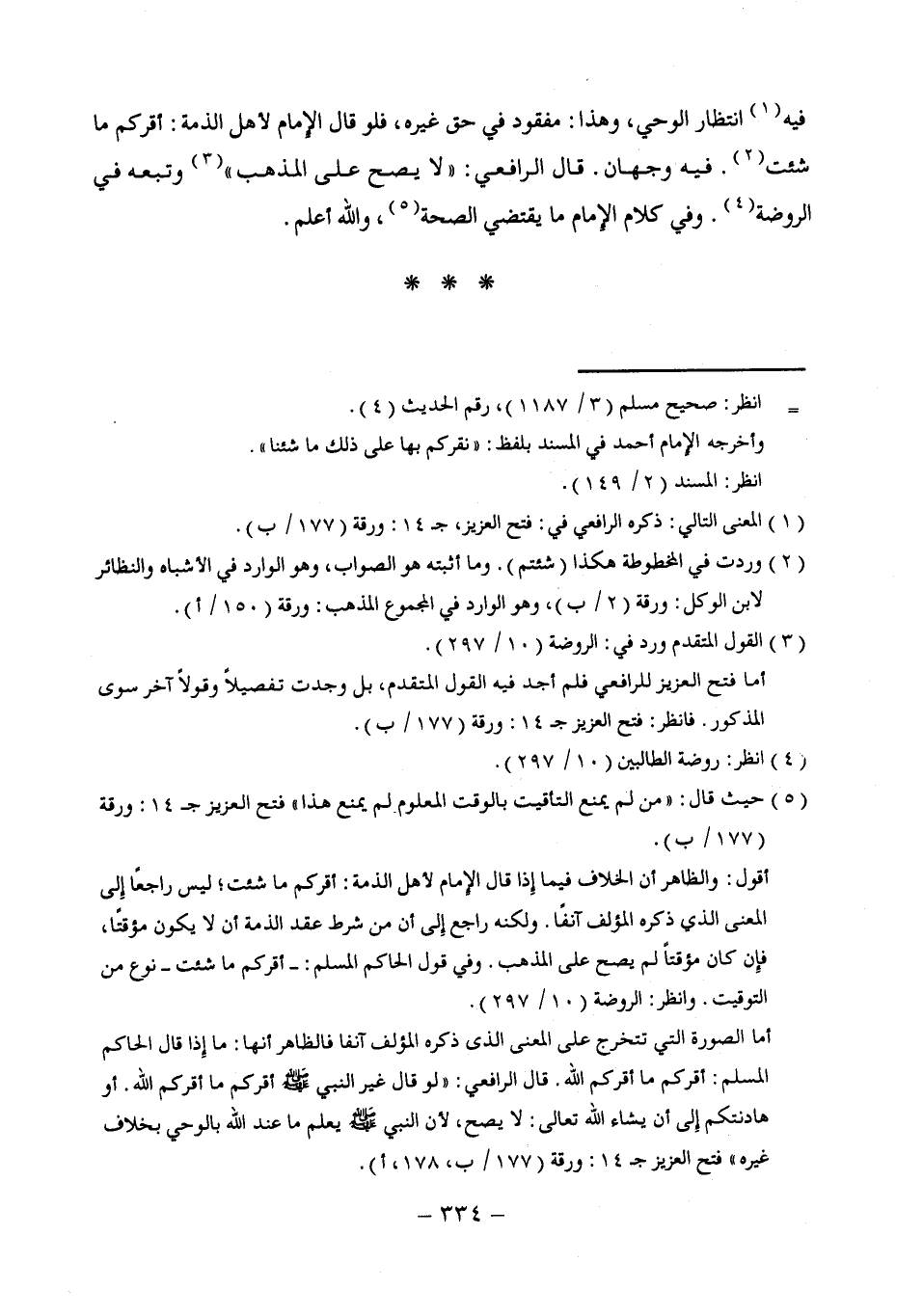 أما الصورة التي تتخرج على المعنى الذى ذكره المؤلف آنفا فالظاهر أنها: ما إِذا قال الحاكم المسلم: أقركم ما أقركم الله. قال الرافعي: "لو قال غير النبي - صلى الله عليه وسلم - أقركم ما أقركم الله. أو هادنتكم إلى أن يشاء الله تعالى: لا يصح؛ لأن النبي - صلى الله عليه وسلم - يعلم ما عند الله بالوحي بخلاف غيره" فتح العزيز جـ 14: ورقة (177 /ب، 178، أ).