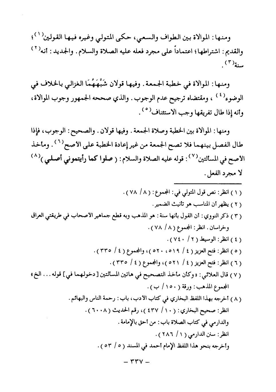ومنها: الموالاة بين الخطبة وصلاة الجمعة. وفيها قولان. والصحيح: الوجوب، فإِذا طال الفصل بينهما فلا تصح الجمعة من غير إعادة الخطبة على الأصح (¬6). ومأخذ الأصح في المسألتين (¬7)، قوله عليه الصلاة والسلام: (صلوا كما رأيتموني أصلي) (¬8) لا مجرد الفعل.