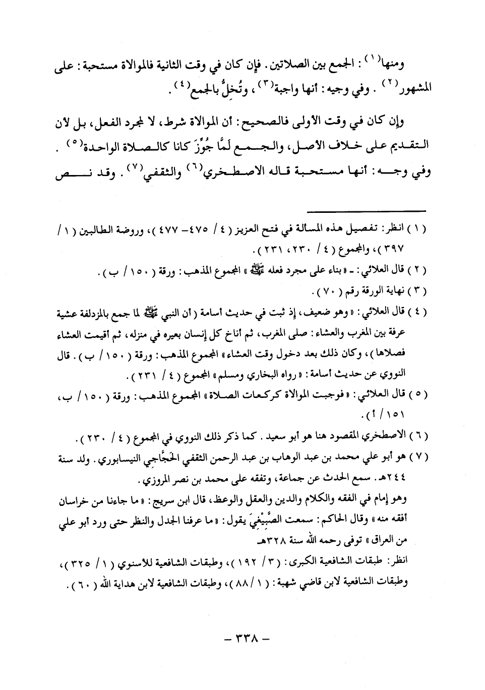 (¬4) قال العلائي: "وهو ضعيف، إِذ ثبت في حديث أسامة (أن النبي - صلى الله عليه وسلم - لما جمع بالمزدلفة عشية عرفة بين المغرب والعشاء: صلى المغرب، ثم أناخ كل إِنسان بعيره في منزله، ثم أقيمت العشاء فصلاها)، وكان ذلك بعد دخول وقت العشاء" المجموع المذهب: ورقة (150 / ب). قال النووى عن حديث أسامة: "رواه البخارى ومسلم" المجموع (4/ 231).