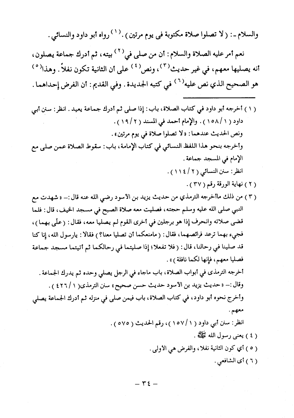 والسلام-: (لا تصلوا صلاة مكتوبة فى يوم مرتين). (¬1) رواه أبو داود والنسائي.