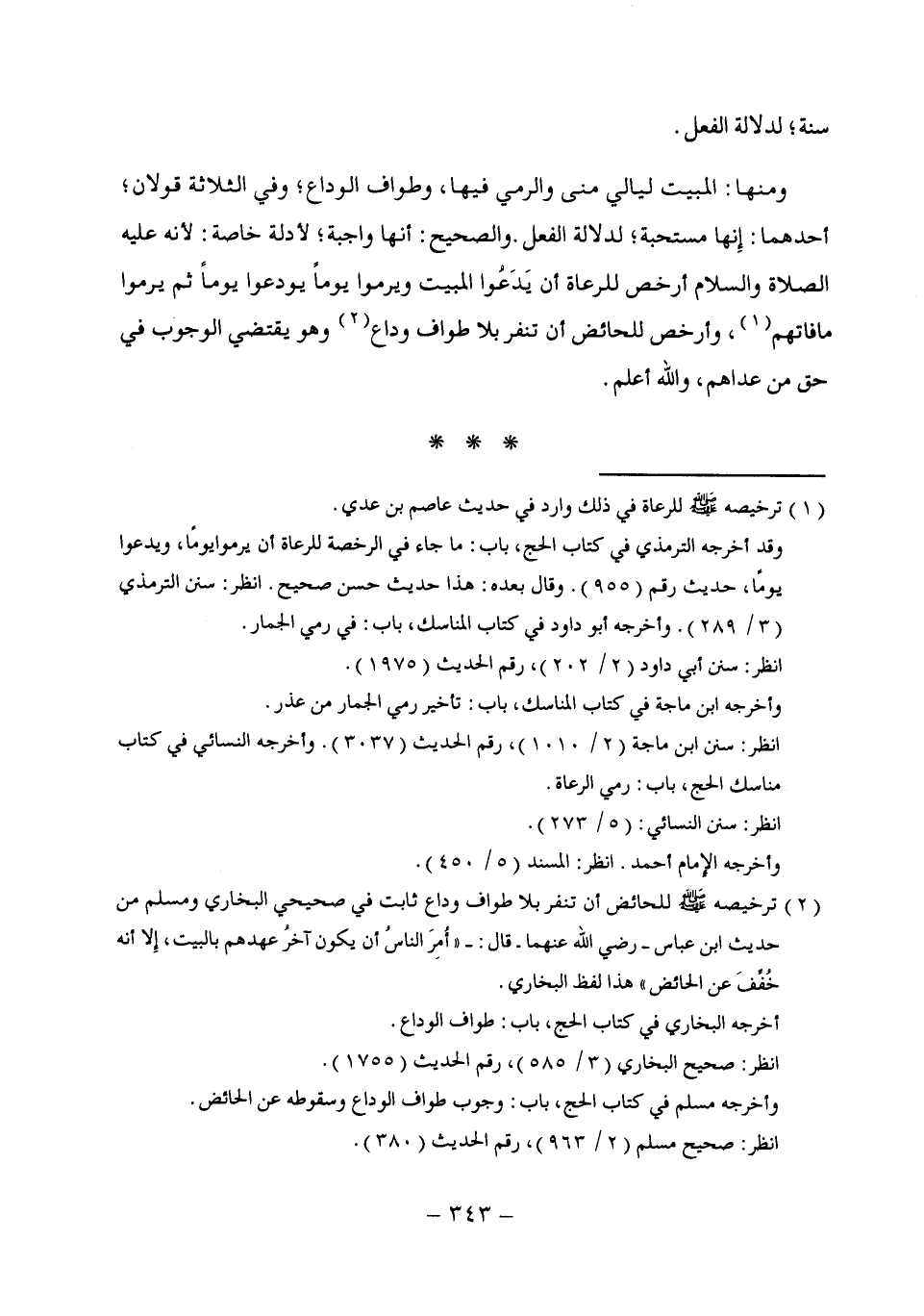 ومنها: المبيت ليالي منى والرمي فيها، وطواف الوداع، وفي الثلاثة قولان، أحدهما: إِنها مستحبة؛ لدلالة الفعل. والصحيح: أنها واجبة؛ لأ دلة خاصة؛ لأنه عليه الصلاة والسلام أرخص للرعاة أن يَدعُوا المبيت ويرموا يوماً يودعوا يوماً ثم يرموا ما فاتهم (¬1)، وأرخص للحائض أن تنفر بلا طواف وداع (¬2) وهو يقتضي الوجوب في حق من عداهم، والله أعلم.